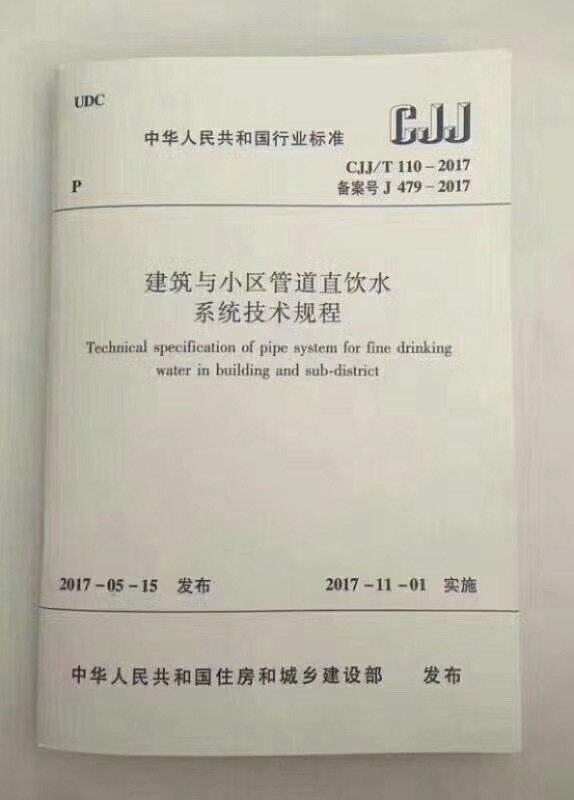 住房城鄉建設部關于發布行業標準《建筑與小區管道直飲水系統技術規程》為行業標準,編號為CJJ/T 110-2017,自2017年11月1日起實施。原行業標準《管道直飲水系統技術規程》CJJ/T 110-2206同時廢止。