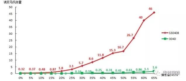 304D與S30408冷加工誘變馬氏體含量隨伸長(zhǎng)率增加而變化圖