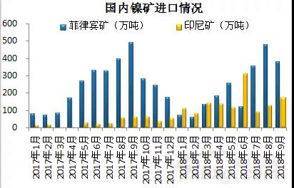 1-9月,中國鎳礦進口量約3461.5萬噸,同比增加871.2萬噸,增幅33.6%。其中從菲律賓進口約2033.6萬噸,同比減少180萬噸,減幅8.1%;從印尼進口約1281.5萬噸,同比增加1054.8萬噸,增幅465.3%。