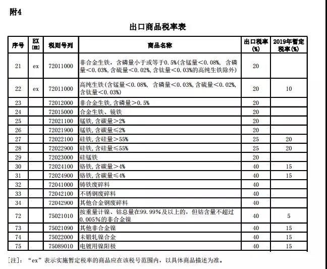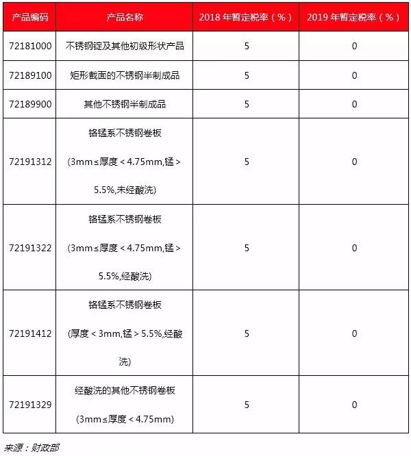 國務院關稅稅則委員會關于2019年進出口暫定稅率等調整方案的通知:為促進經濟高質量發展和進出口貿易穩定增長,根據《中華人民共和國進出口關稅條例》的相關規定,自2019年1月1日起對部分商品的進出口關稅進行調整,其中涉及部分不銹鋼進出口制品的稅率變化。