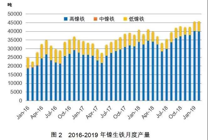 2019年1-2月中國鎳生鐵累計產量為9.15萬噸,同比增加15.3%,其中高鎳鐵8.01萬噸,同比增加20.7%,低鎳鐵1.13萬噸,同比減少12.6%。