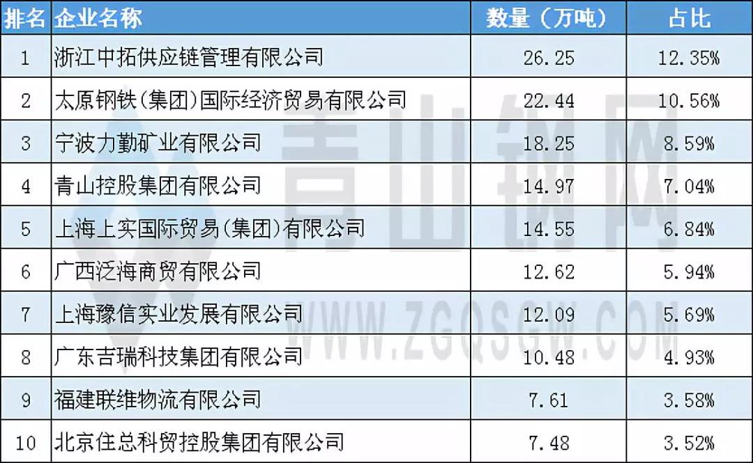 據海關數據顯示,2月我國鎳礦進口前十企業分別為:浙江中拓(26.25),太鋼國貿(22.44),寧波力勤(18.25),青山控股(14.97),上海上實(14.55),廣西泛海(12.62),上海豫信(12.09),廣東吉瑞科技(10.48),福建聯維(7.61),北京住總(7.48)。(單位:萬噸)。