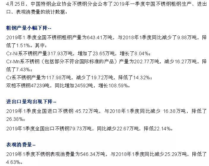 2019年1季度不銹鋼產量、進出口均下降 雙卡壓管件